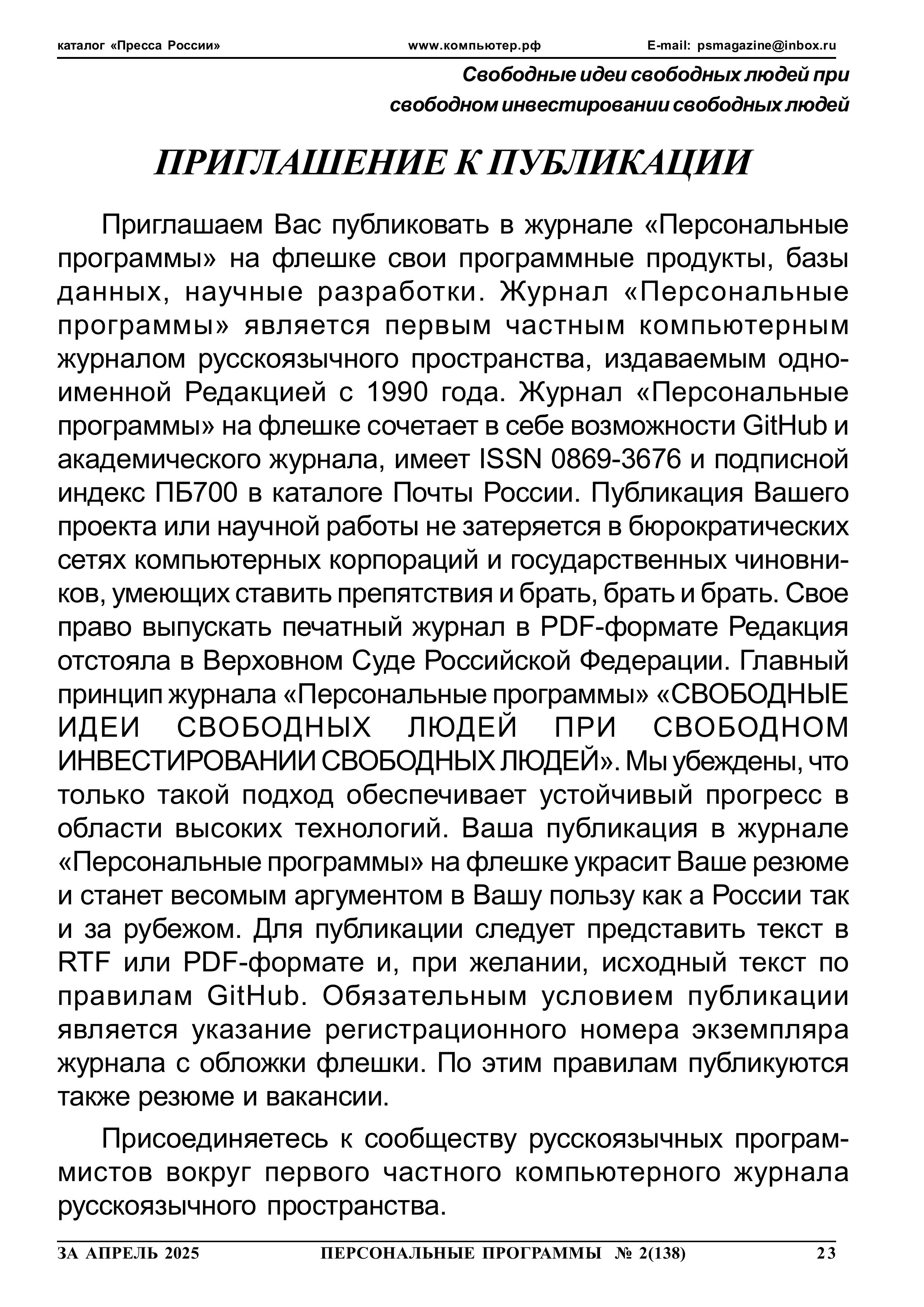 Приглашение к публикации 2025 год 2 номер 023 страница