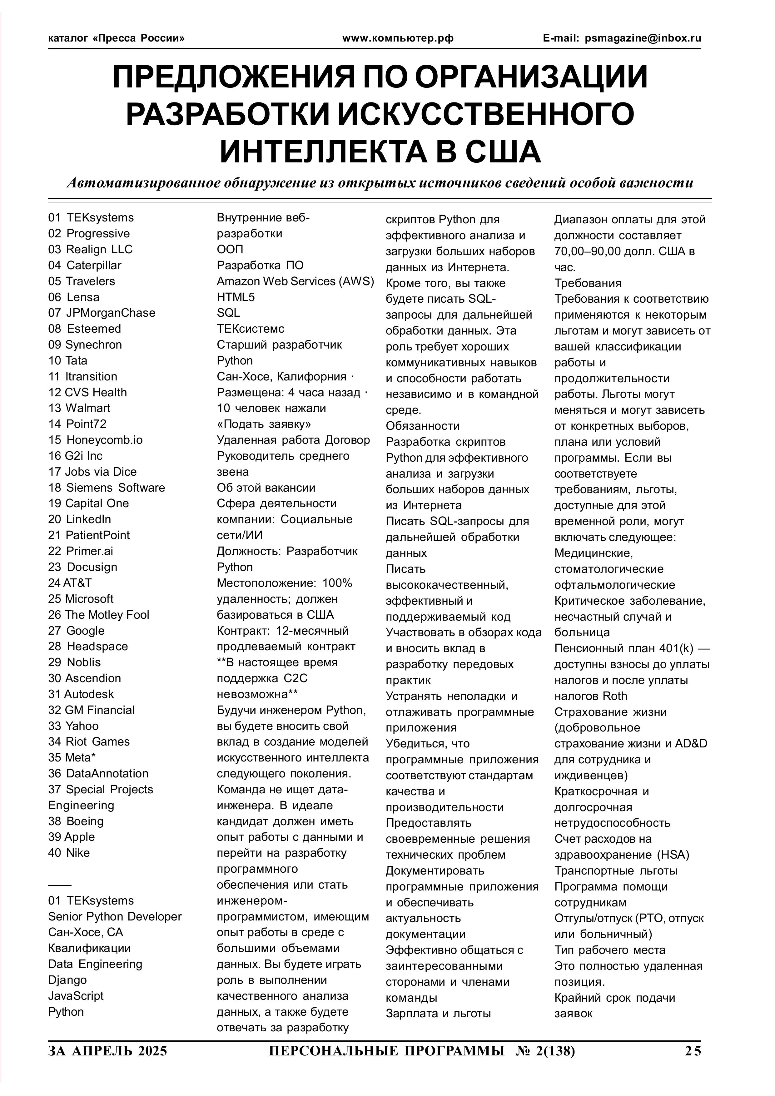 ПРЕДЛОЖЕНИЯ ПО ОРГАНИЗАЦИИ РАЗРАБОТКИ ИСКУССТВЕННОГО ИНТЕЛЛЕКТА В США 2025 год 2 номер 025 страница