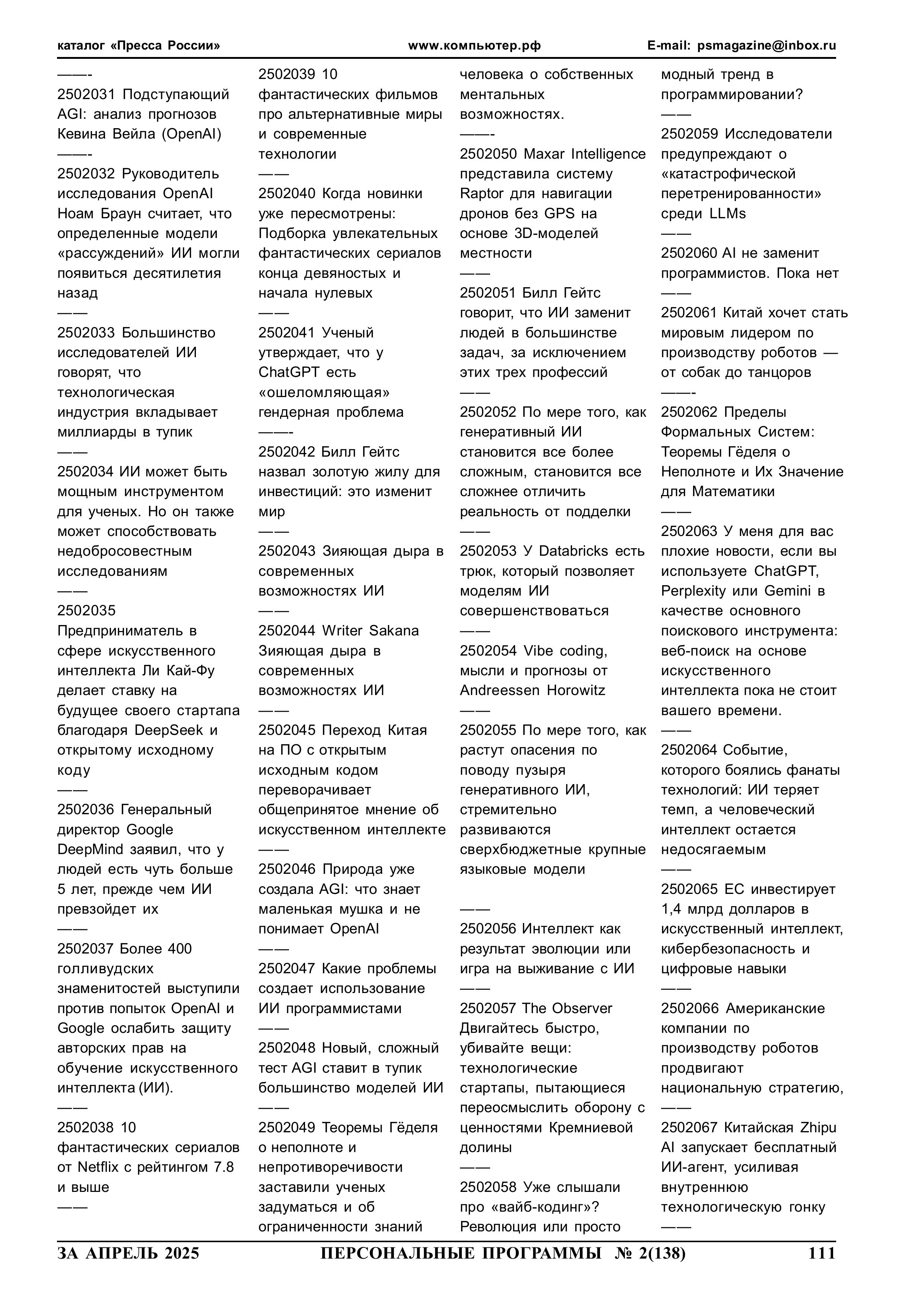 МОРЕ ИСКУССТВЕННОГО ИНТЕЛЛЕКТА Содержание. Статьи 31-67 2025 год 2 номер 111 страница