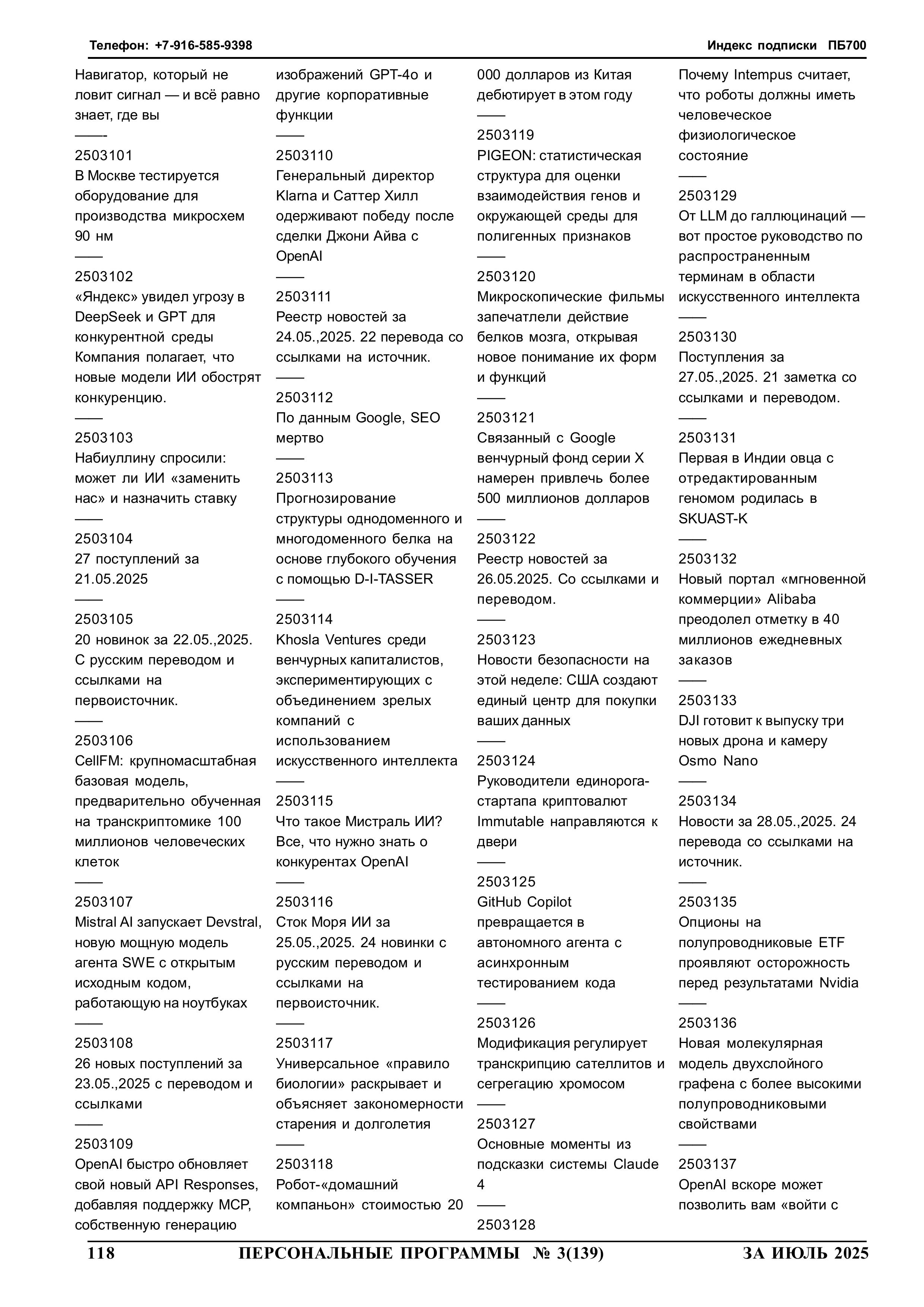 МОРЕ ИСКУССТВЕННОГО ИНТЕЛЛЕКТА Автоматизированное обнаружение из открытых источников сведений особой важности Краткие аннотации 1461 статьи в шести дополнительных томах на флешке Computer-2025-06, Computer-2025-07, Computer-2025-08, Computer-2025-09, Computer-2025-10 и Computer-2025-11 2025 год N 3 стр.118