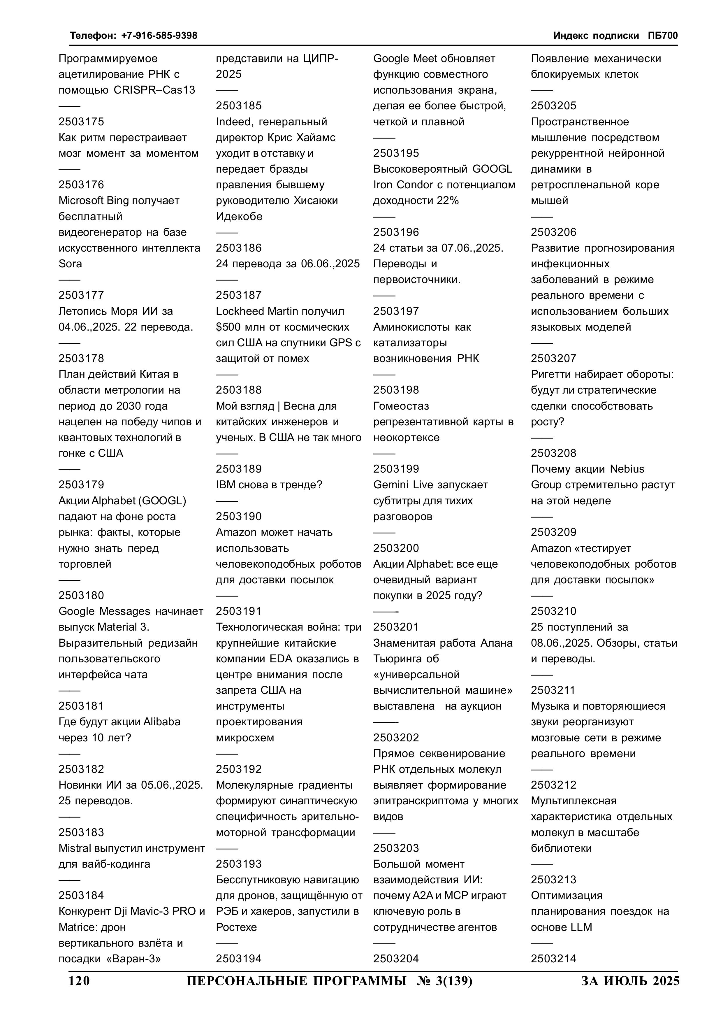 МОРЕ ИСКУССТВЕННОГО ИНТЕЛЛЕКТА Автоматизированное обнаружение из открытых источников сведений особой важности Краткие аннотации 1461 статьи в шести дополнительных томах на флешке Computer-2025-06, Computer-2025-07, Computer-2025-08, Computer-2025-09, Computer-2025-10 и Computer-2025-11 2025 год N 3 стр.120