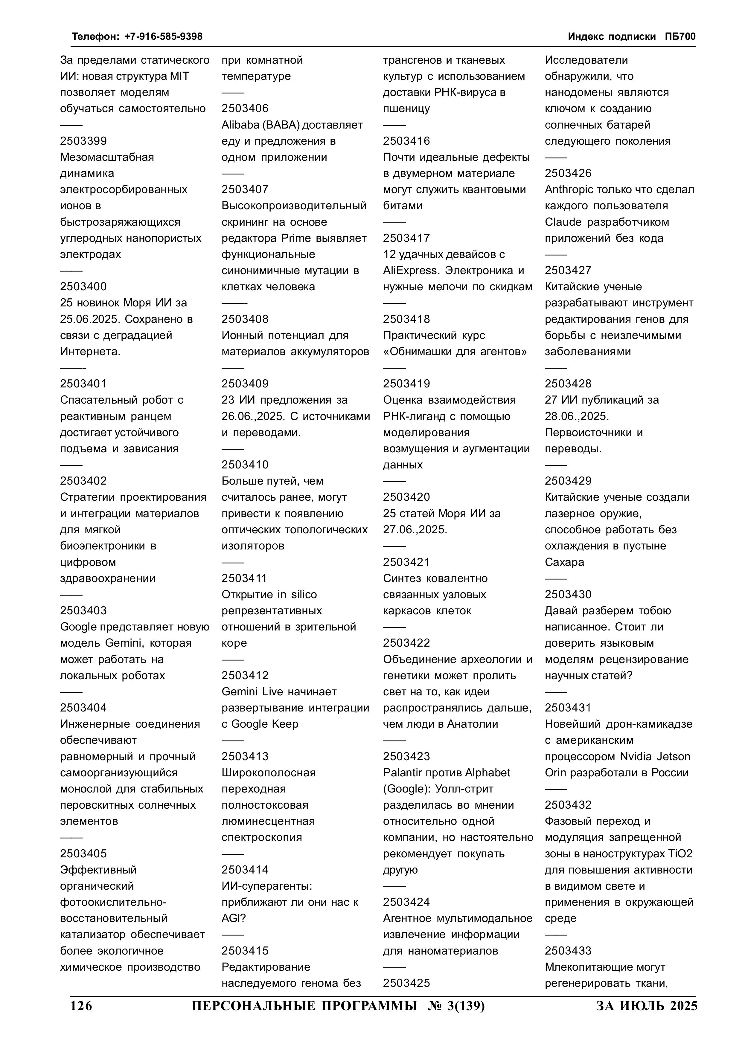 МОРЕ ИСКУССТВЕННОГО ИНТЕЛЛЕКТА Автоматизированное обнаружение из открытых источников сведений особой важности Краткие аннотации 1461 статьи в шести дополнительных томах на флешке Computer-2025-06, Computer-2025-07, Computer-2025-08, Computer-2025-09, Computer-2025-10 и Computer-2025-11 2025 год N 3 стр.126
