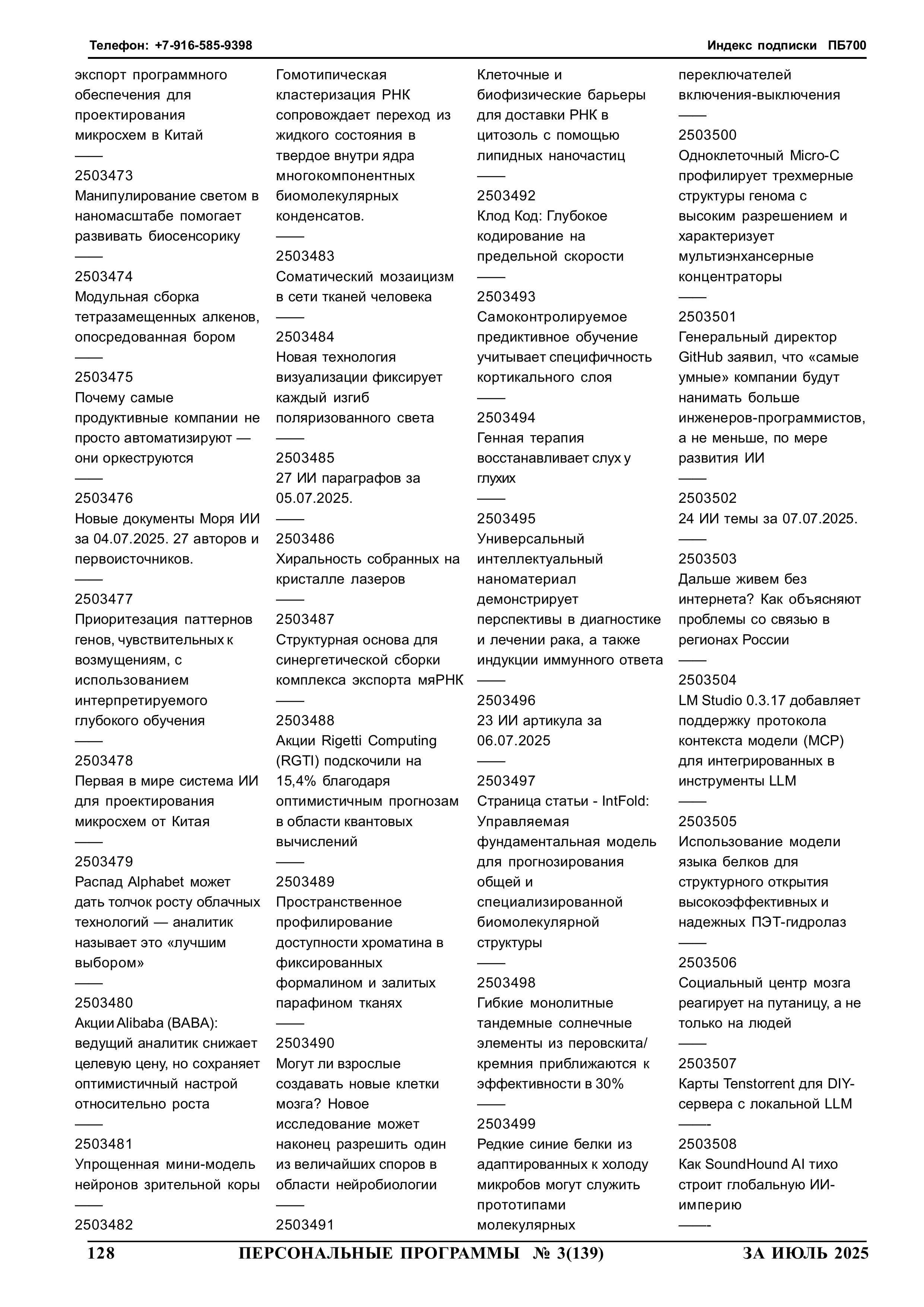 МОРЕ ИСКУССТВЕННОГО ИНТЕЛЛЕКТА Автоматизированное обнаружение из открытых источников сведений особой важности Краткие аннотации 1461 статьи в шести дополнительных томах на флешке Computer-2025-06, Computer-2025-07, Computer-2025-08, Computer-2025-09, Computer-2025-10 и Computer-2025-11 2025 год N 3 стр.128