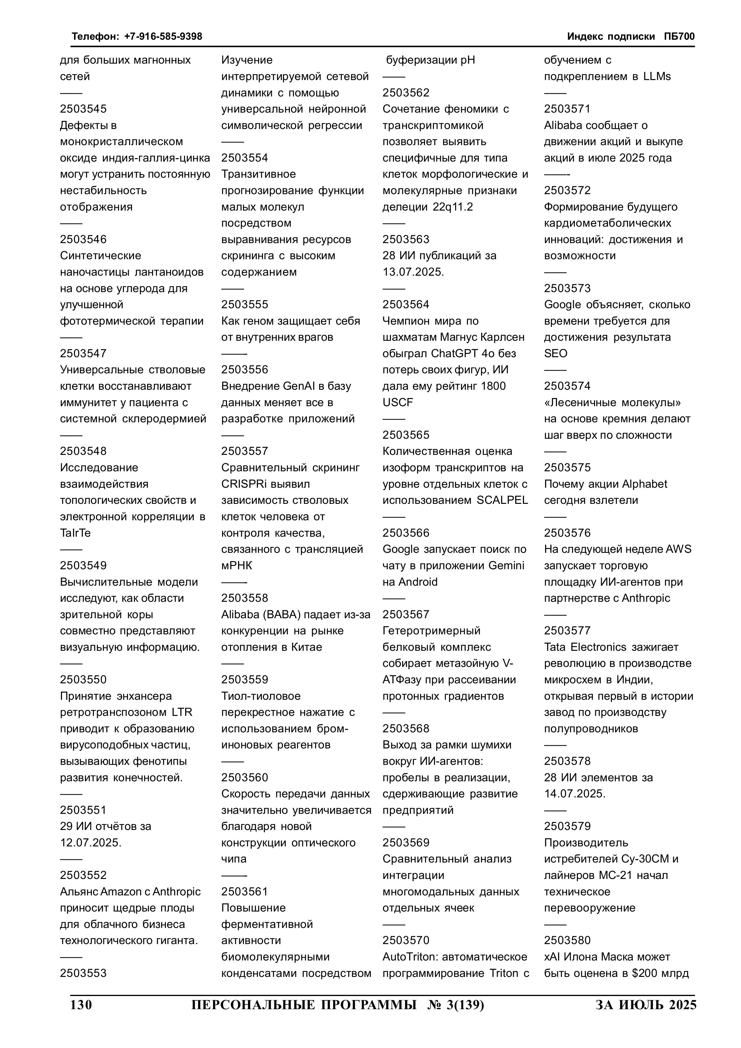 МОРЕ ИСКУССТВЕННОГО ИНТЕЛЛЕКТА Автоматизированное обнаружение из открытых источников сведений особой важности Краткие аннотации 1461 статьи в шести дополнительных томах на флешке Computer-2025-06, Computer-2025-07, Computer-2025-08, Computer-2025-09, Computer-2025-10 и Computer-2025-11 2025 год N 3 стр.130