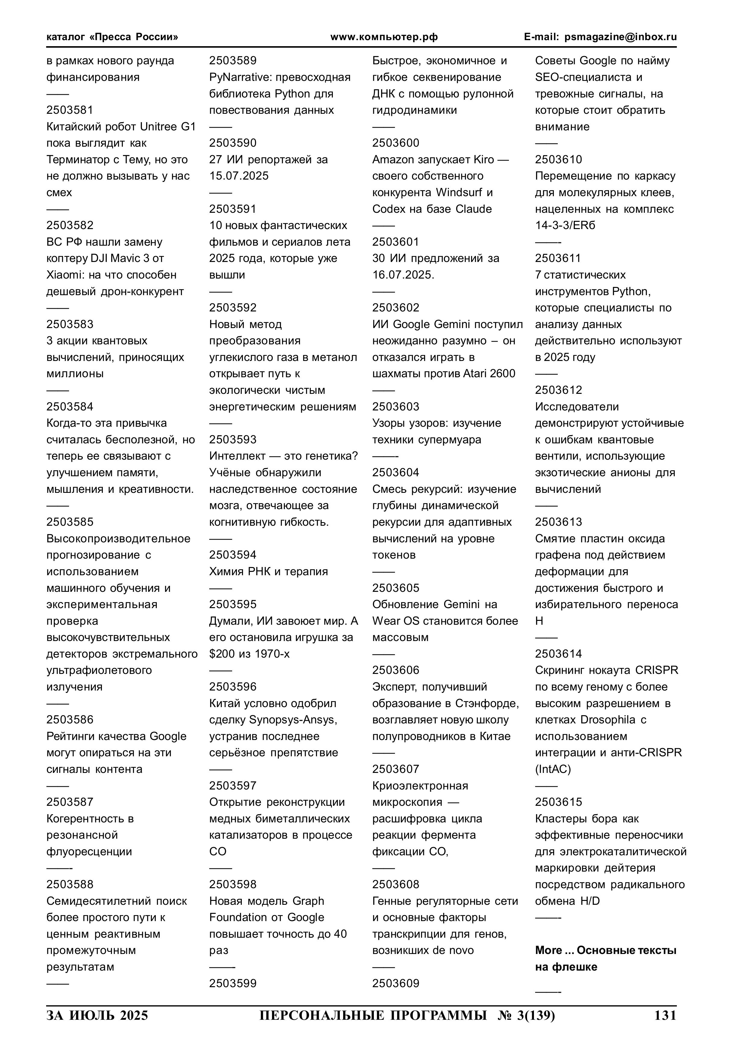 МОРЕ ИСКУССТВЕННОГО ИНТЕЛЛЕКТА Автоматизированное обнаружение из открытых источников сведений особой важности Краткие аннотации 1461 статьи в шести дополнительных томах на флешке Computer-2025-06, Computer-2025-07, Computer-2025-08, Computer-2025-09, Computer-2025-10 и Computer-2025-11 2025 год N 3 стр.131