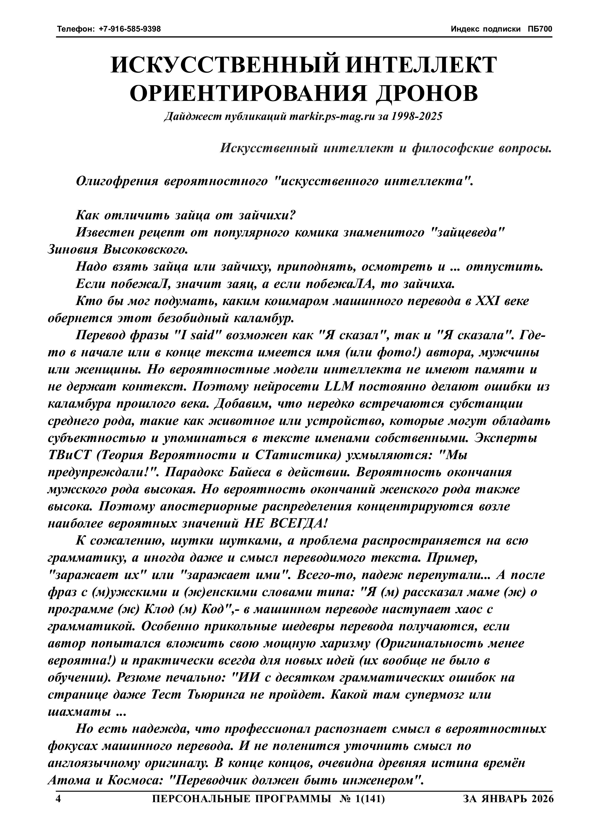 Журнал "Персональные программы" на флешке 2026 год, N 1, стр.004 Олигофрения вероятностного "искусственного интеллекта".