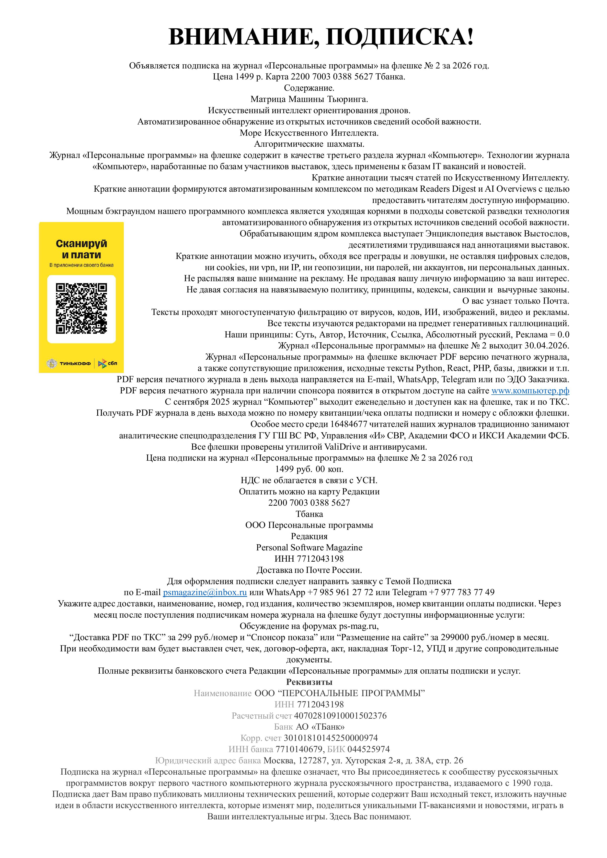 Журнал "Персональные программы" на флешке 2026 год, N 1, стр.118 ВНИМАНИЕ, ПОДПИСКА! Краткие аннотации тысяч статей по Искусственному Интеллекту. Краткие аннотации формируются автоматизированным комплексом по методикам Readers Digest и AI Overviews с целью предоставить читателям доступную информацию. Наши принципы: Суть, Автор, Источник, Ссылка, Абсолютный русский, Реклама = 0.0